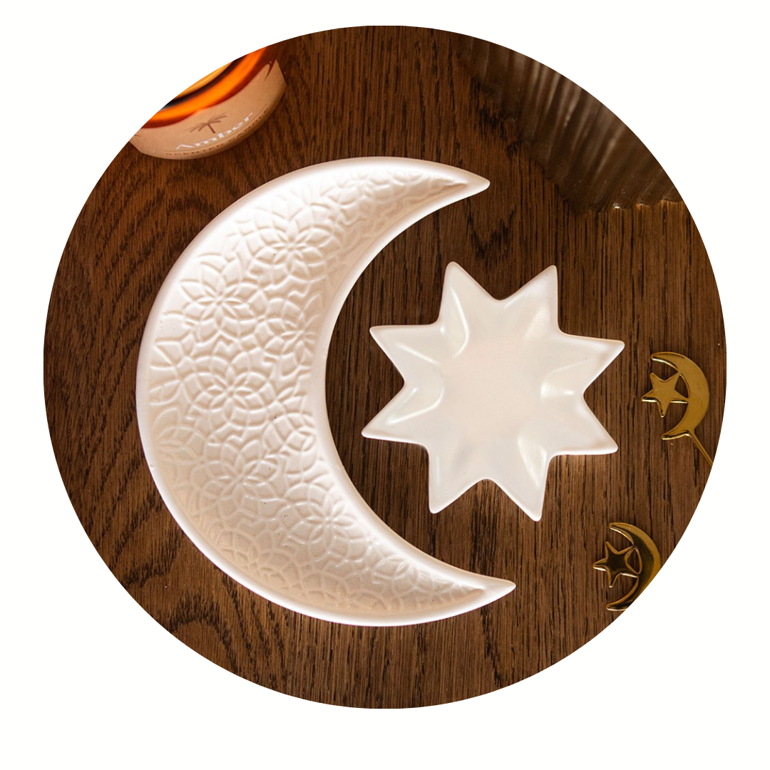 Deze elegante set keramische schaaltjes bestaat uit een halvemaan en een ster, perfect voor het opbergen van sieraden, kleine lekkernijen of als verfijnd decoratief accent. De schaaltjes zijn afgewerkt met een zachte crèmekleurige glazuurlaag en subtiele reliëfdetails, wat zorgt voor een luxe en tijdloze uitstraling.