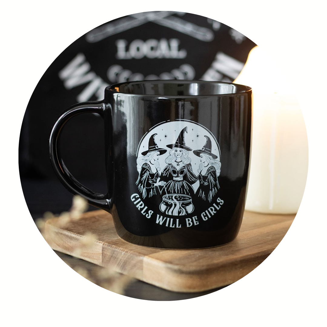 Breng wat magie in je ochtendritueel met deze zwarte mok met drie betoverende heksen en de tekst ‘Girls Will Be Girls’. Perfect om vriendschap, sisterhood en een tikkeltje eigenzinnigheid te vieren – uiteraard met een magische twist.